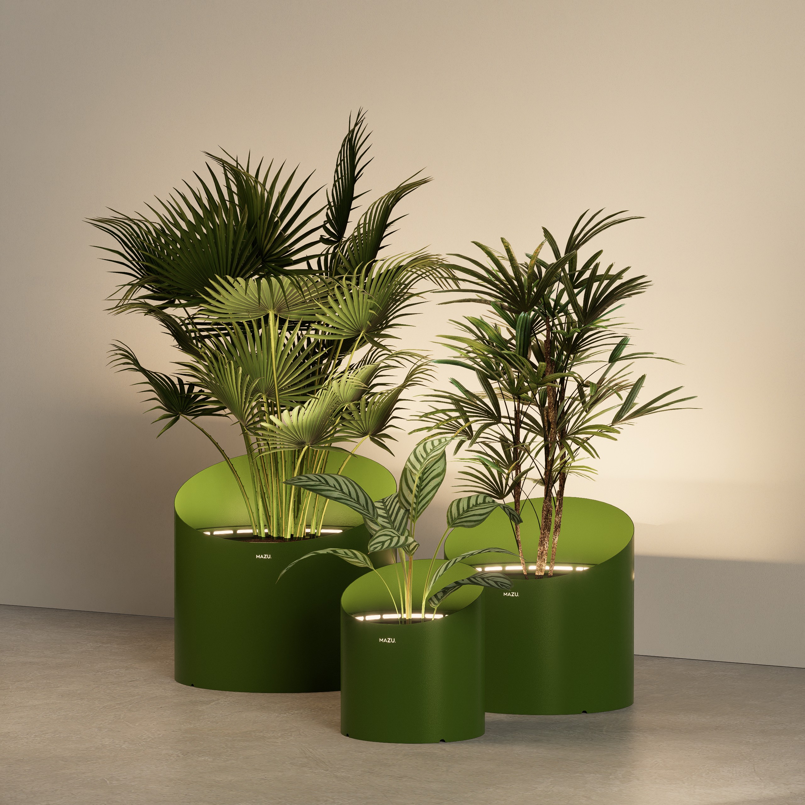 This refined planter features a sleek geometric design with three height variations, a tapered base that expands towards the top, and an illuminated band in the middle, making it both a striking and functional addition to any space.